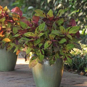 This coleus has a unique mix of mosaic patterns in reds, greens, and yellows. It will tolerate the sun and performs great in the shade. Ideal for beds and pots.