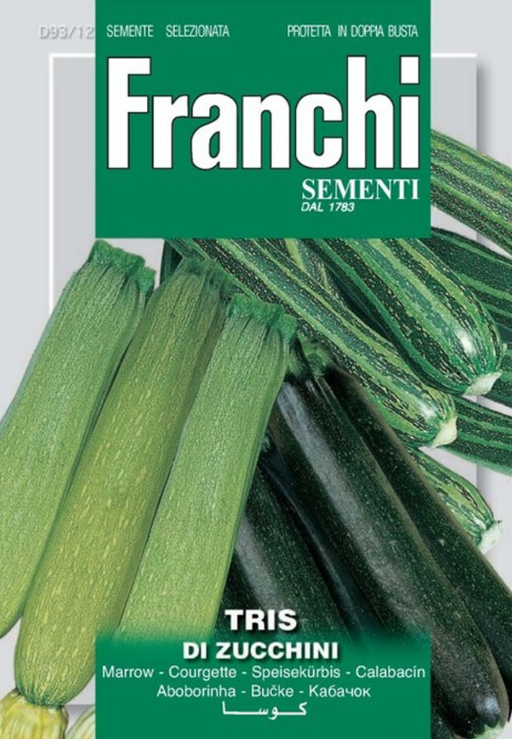 TRIS OF COURGETTES – A striped Italian variety, a light coloured variety from Liguria and a dark courgette from Milan. Sow late spring to early summer and harvest 72 days later. The male flowers are delicious to eat once the crown and stamen have been removed.