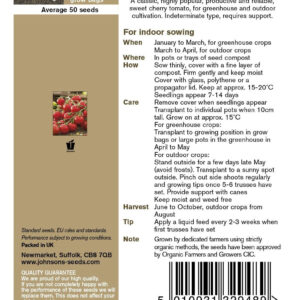 These are organic seed of Tomato Cerise. It is a classic and highly popular variety which is very reliable producing sweet cherry tomato Perfect for greenhouse and outdoor cultivation. It is an Indeterminate type that requires support.