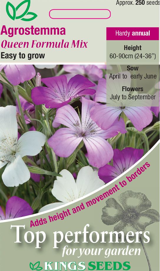 Kings Seeds – Flower – Agrostemma Queen Formula Mix :- This attractive mixture of white, purple and mauve flowers is easy to grow and adds height to the border display.