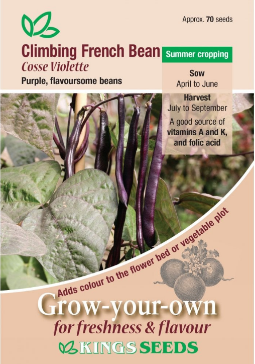 Cosse Violette have beautiful deep purple pods which turn dark green on cooking. They have a fine flavour and harvests over a long period in either glasshouse or out in the open. Climbing beans such as this variety should be supported much in the same way as runner beans.