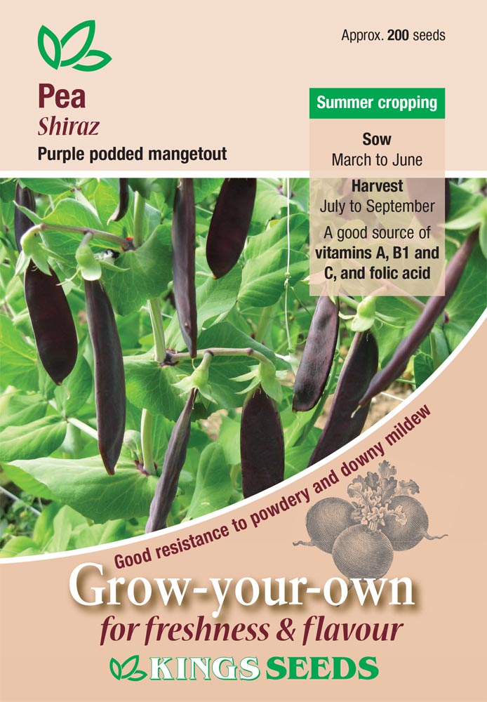The pretty bi-colour flowers of the Shiraz pea form stunning flat purple pods that are best harvested when young and eaten raw. Shiraz is resistant to Powdery and Downy Mildew.