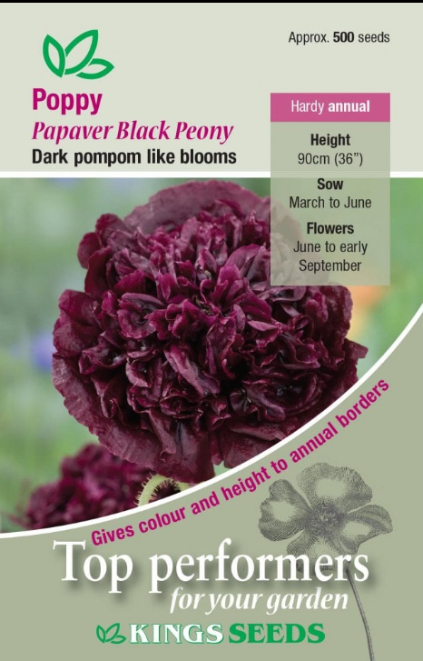 An incredibly glamorous poppy with sumptuous double peony flowers in the deepest purple, almost black shade. Ideal for adding height and interest to annual borders. Height: 90cm Hardy annual – paeoniflorum type