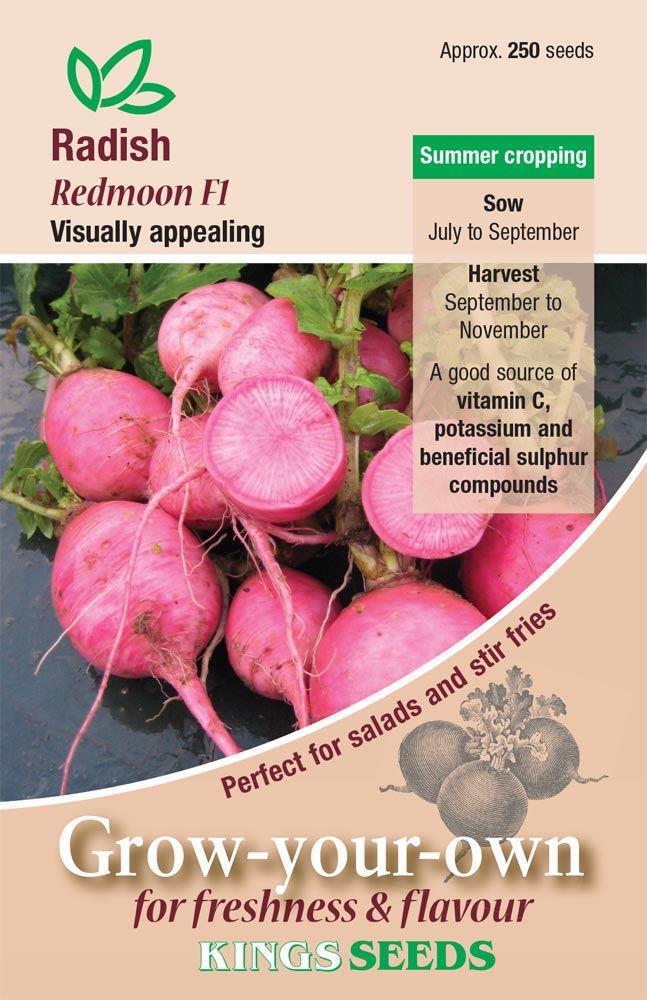 Kings Seeds – Vegetable – Radish Redmoon :- These have appealing conical shape roots, red skin and rose-pink flesh. Mild and refreshing flavour. With its crisp texture, and visually appealing when sliced into salads. Best sown late summer for autumn harvesting.