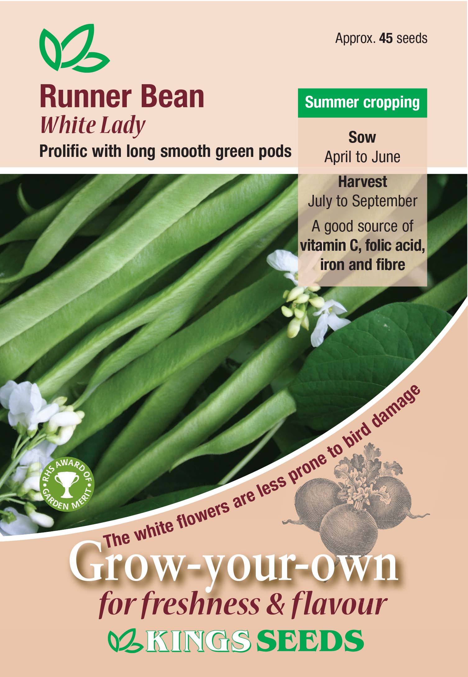 White Lady is a premier variety of runner bean plant in every way. The long, mid-green pods with white seeds hang in numerous clusters, and are both smooth and stringless. The result is a delicious vegetable, which can be sliced or eaten whole. The pure white flowers are less prone to being picked by birds, so the resulting crop is much greater.