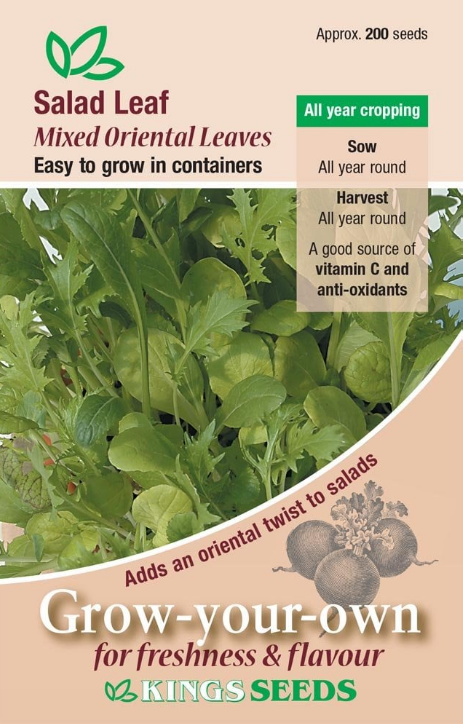 Grow your own tasty colourful salad leaves which are packed full of nutrients. There is nothing quite as special and rewarding as going out to your own garden and selecting home grown produce to use in your meals.This mixture contains : Mibuna (17%), Mustard Red Giant (16%) , Pak choi shanghai (17%), Komatsuma Tender green (17%), Mizuna (17%) , Chinese Cabbage Wonk Bok (16%)Â