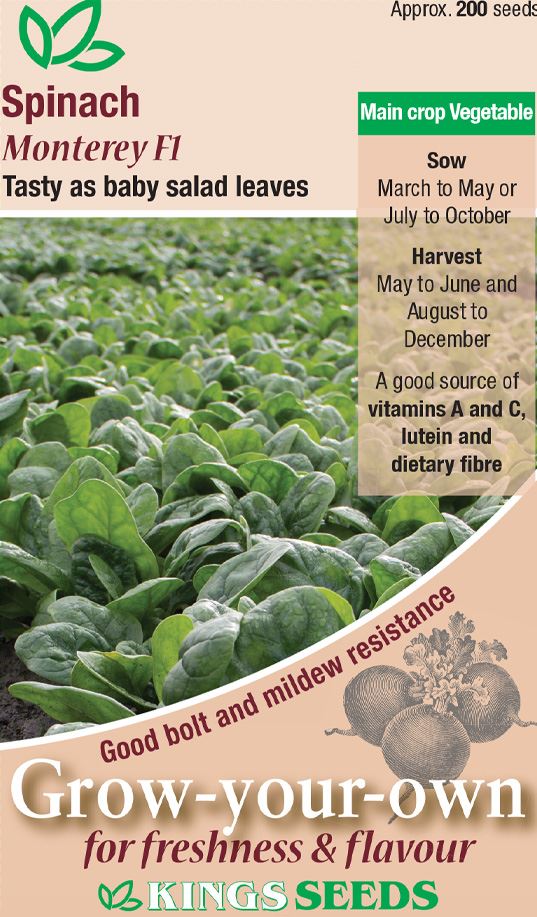 Kings Seeds – Vegetable – Spinach Monterey F1 :- A quick growing and suitable for sowing all year round, outside during warmer months and undercover during colder months. Monterey has dark green leaves and a good resistance to downy mildew.