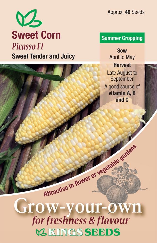 Kings Seeds – Vegetable – Sweet Corn Picasso F1 :- An edible ornamental producing purple flowers and the stalks & cob leaves are also tinged with purple making them stand out on the plot or even the flower garden. Incredibly sweet tender and juicy , 20cm long bi-coloured cobs, even when eaten raw.