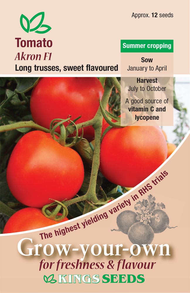 Grow your own Tomato Akron plants from Seeds. This is one of the highest yielding tomatoes with long trusses up to 11 deep red fruits with good inner flesh colour and excellent flavour. A popular variety which is an indeterminate type.