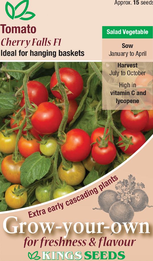 Tomato Cherry Falls is a compact bush type which is a strong growing tomato plant for hanging baskets or patio containers. It is a low maintenance plant. The red cherry tomatoes have of exceptional flavour, the fruits ripen early. The harvest period can but up to 5 weeks.