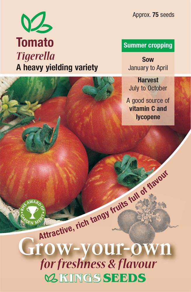 Tomato Tigerella is a distinct variety will its red tomatoes with orange-yellow stripes. This variety has a wonder flavour as well as visual beauty. It is high yielding. The tomato is a indeterminate type.