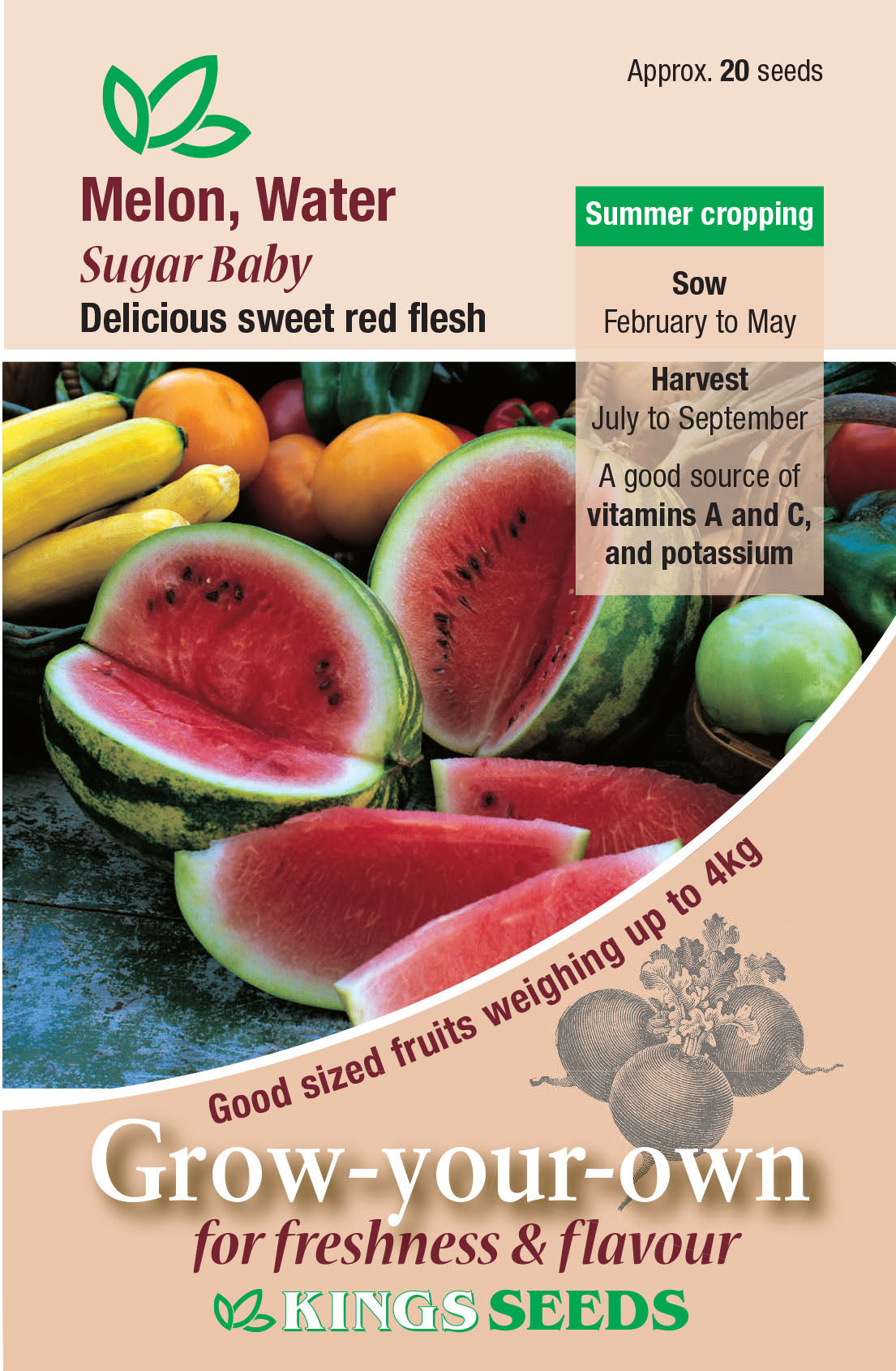Not a vegetable normally associated with British gardens, but given an early start and plenty of care, you can enjoy the delicious fresh taste of your very own water melons. Sugar Baby produces small round fruits of about 20cm in diameter averaging 4kg in weight. The skin turns almost black when ripe with a sweet red flesh within. The plants have a trailing habit so need a lot of room or training around and within pots.