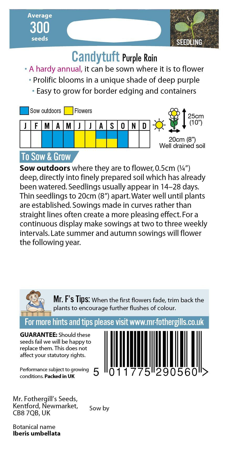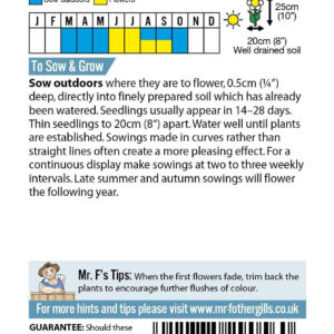 Can be sown where it is to flower. This unique plant produces prolific vibrant, deep purple blooms, measuring 2in across. Plants are compact with bright green foliage. An ideal choice for the lower border or pots and containers on the patio. Mass planting displays will also look very eye-catching. Easy to grow and fast flowering. Height: 25cm(10in) Hardy Annual.