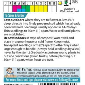 Sow outdoors: where they are to flower, 0.5cm(¼in) deep, directly into finely prepared soil which has already been watered. Seedlings usually appear in 14-28 days. Thin seedlings to 30cm(1ft) apart. Water well until plants are established.