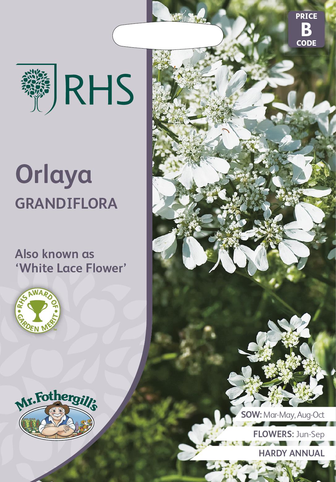 Also known as ‘White Lace Flower’ Free flowering over a long period and loved by insects. this versatile annual Winner of an RHS Award of Garden Merit for reliability and good performance.Part of the seed range produced by Mr Fothergill�s Seeds in partnership with the RHS. Sow March to April in trays of seed compost. Sow thinly, cover with a fine layer of compost. Firm gently and keep moist. Cover tray with glass, polythene or propagator lid. Keep at approx. 15-20�C. Seedlings appear 14-28 days. Remove cover when seedlings appear. When large enough transplant 5cm apart in trays. Stand outside for a few days late May (avoid frosts). Then transplant 25cm apart in flowering position. Flowers June to September. Remove dead heads to prolong flowering Protect autumn sowings with cloches over winter