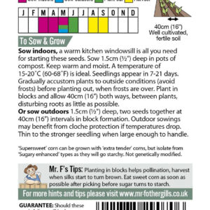 A ‘Supersweet’ variety bred to mature quickly for a shorter growing season. Possibly the sweetest early season variety of all! Very Reliable in the UK climate, showing good vigour in cold conditions and resistance to common diseases. Produces high quality crops of large kernels