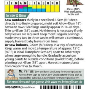 Used for ‘cut and come again’ baby leaves. Or, can be left to mature as larger ‘greens’. Plants are vigorous. An excellent source of vitamin C and A.
