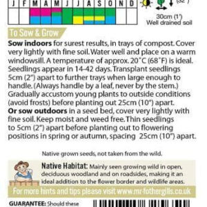 Sow outdoors:Â in a seed bed, cover very lightly with fine soil. Keep moist and weed free. Thin seedlings to 5cm apart before planting out to flowering positions in spring or autumn, spacing 25cm apart