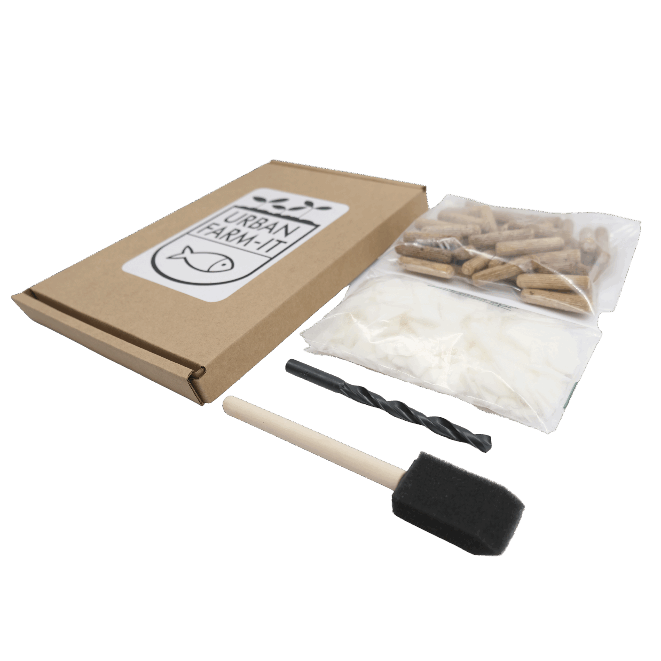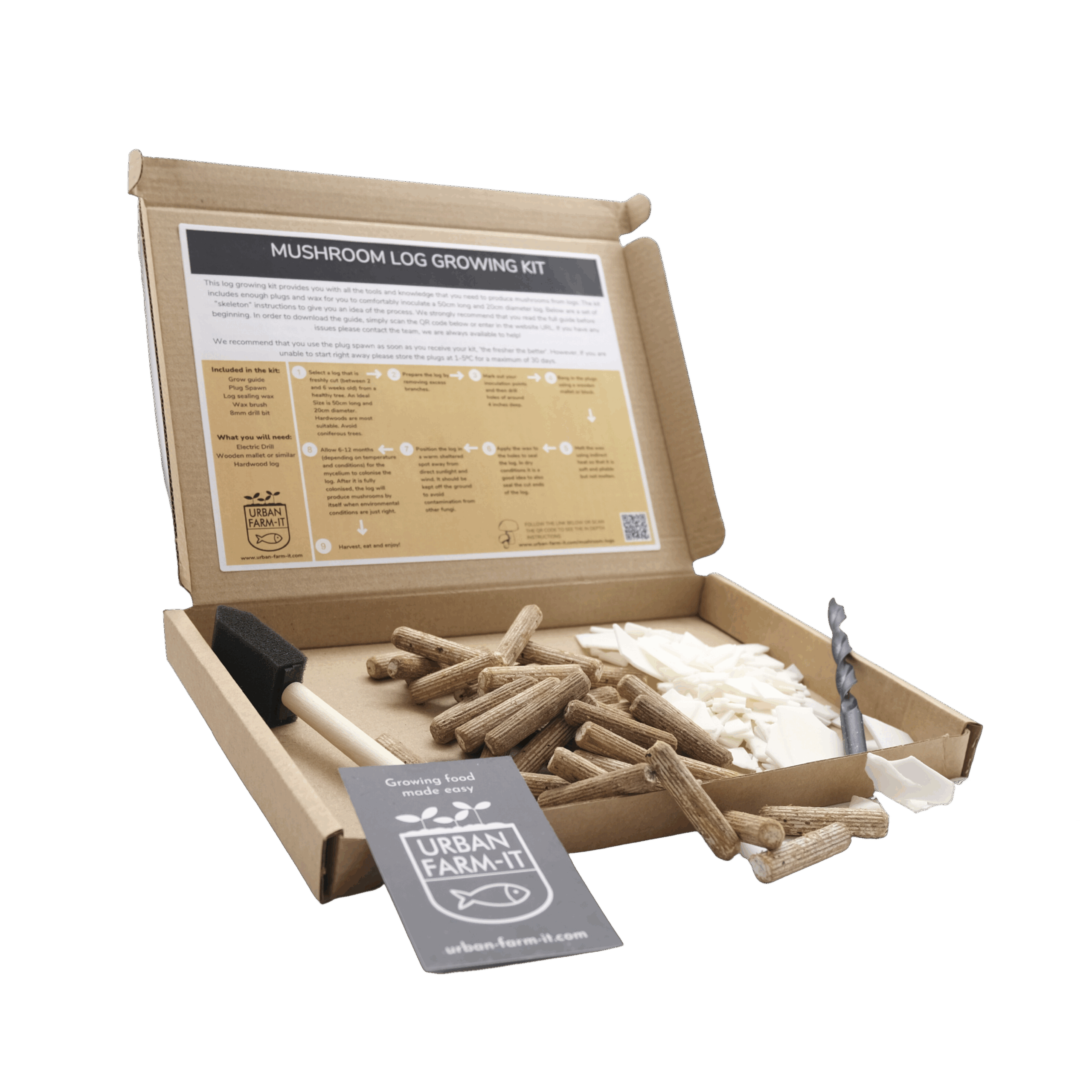 Each kit contains  50 fresh blue oyster plugs, log sealing wax, waxing brush, drill bit and detailed growing instructions provided by experienced growers.