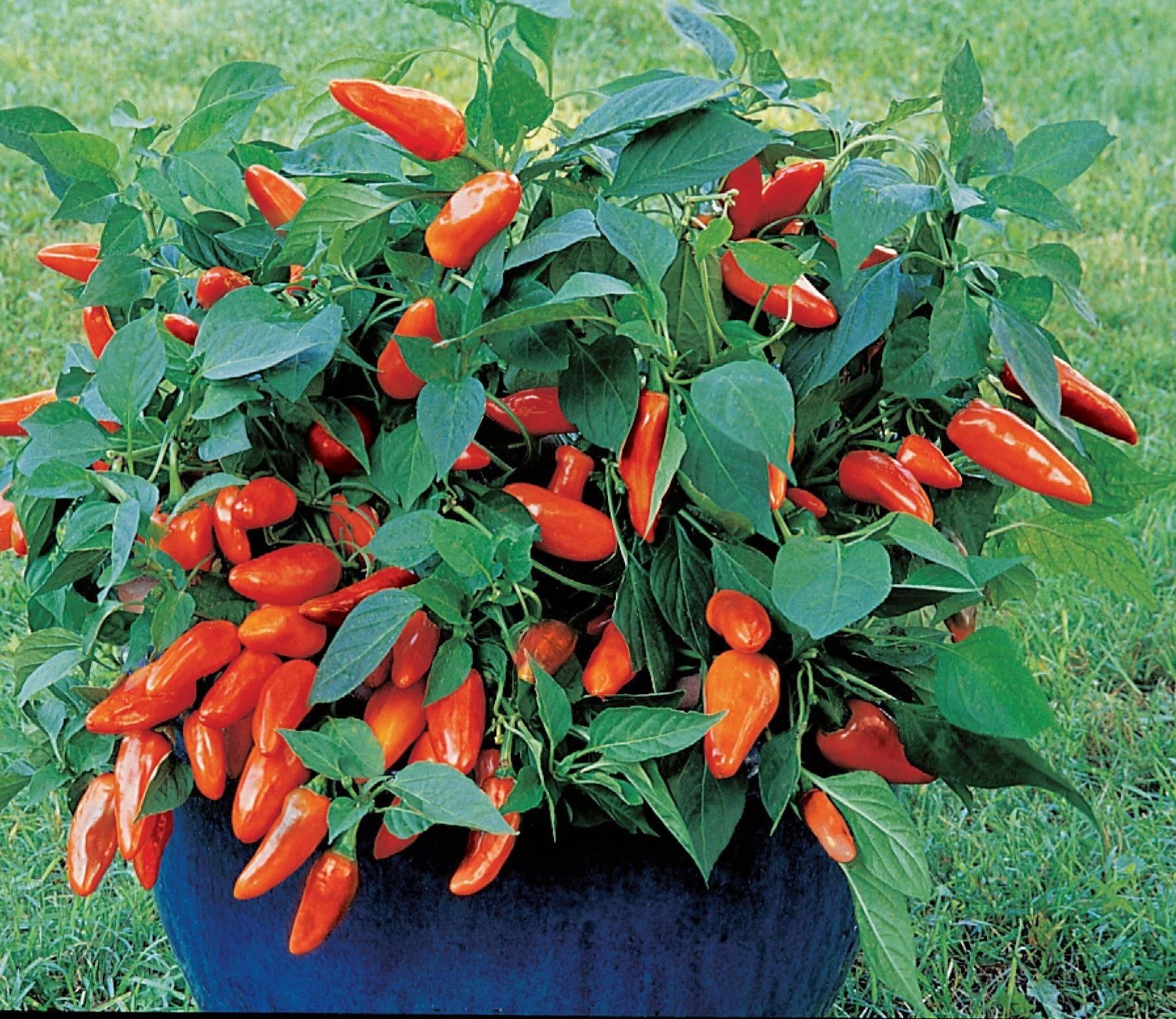 This variety produces little bushes studded all over with shiny red-orange rockets. It’s a very tasty pepper, with a hint of heat. The peppers are sweet and delicious, either pickled or served on salad platters.