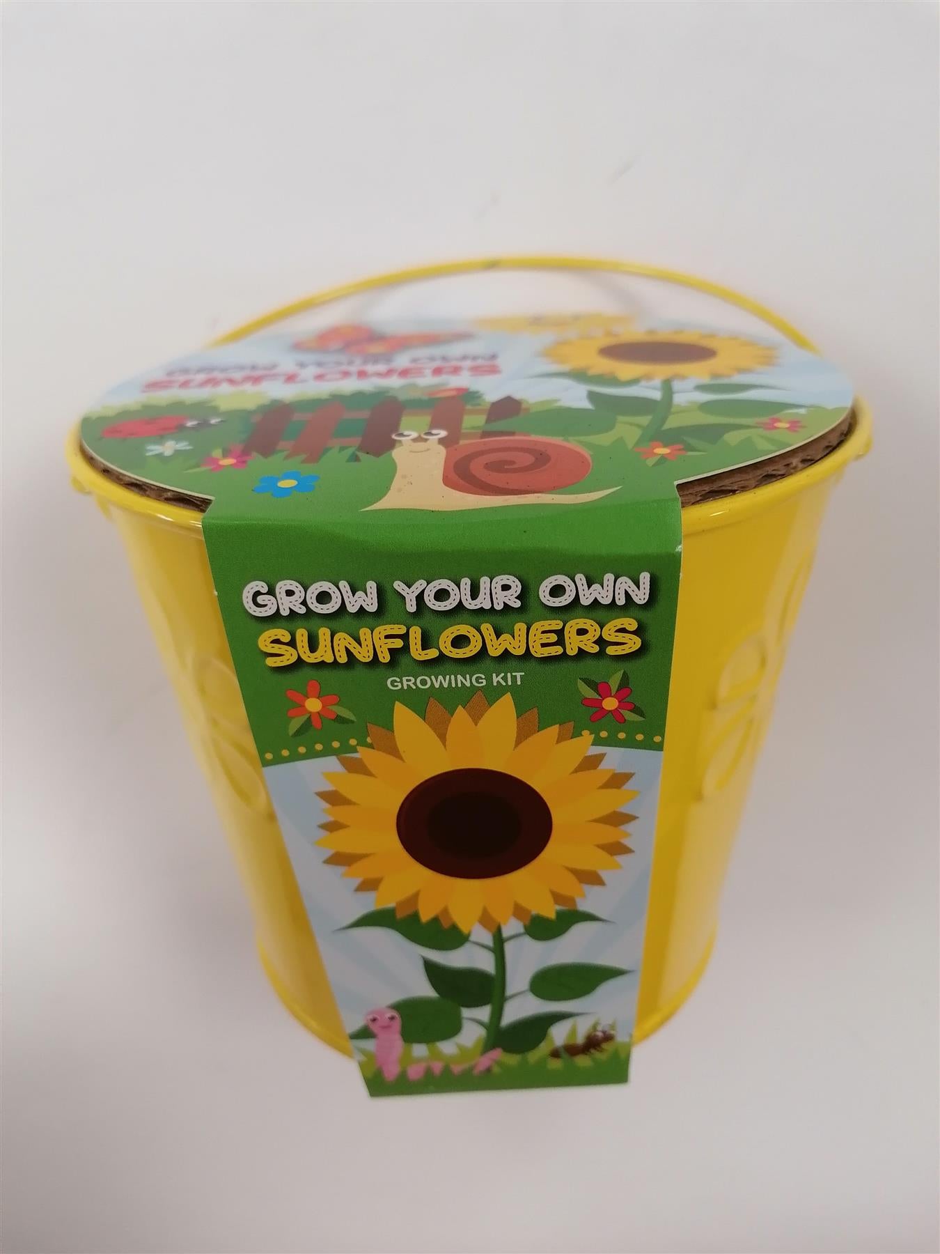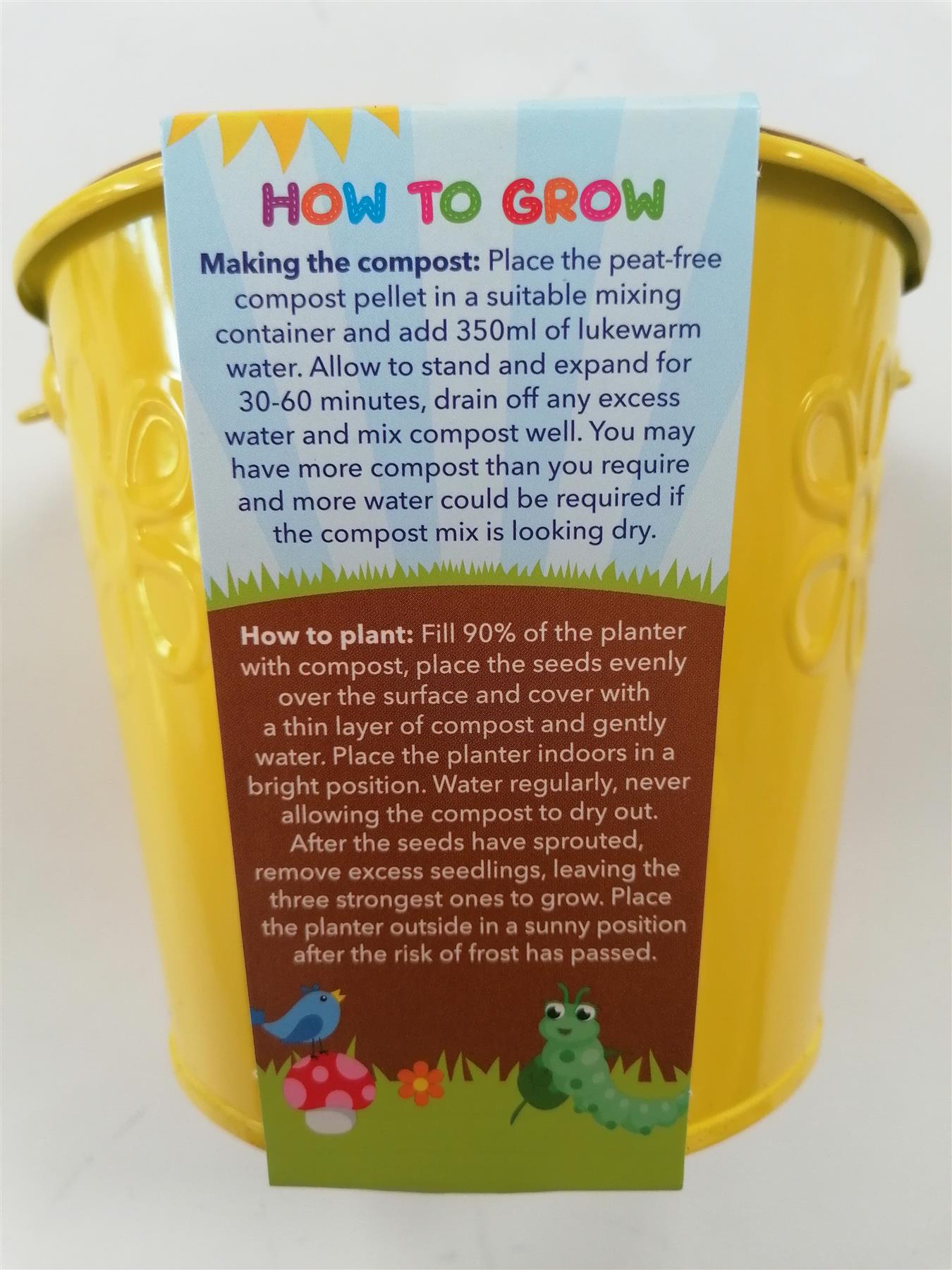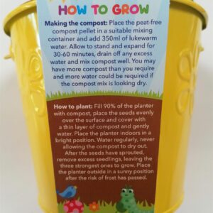 A yellow bucket makes for a great gift and fun project. Teach children how to garden and grow their own flowers. Each kit includes a painted metal bucket, seed packet, peat free growing pellet, and growing instructions.