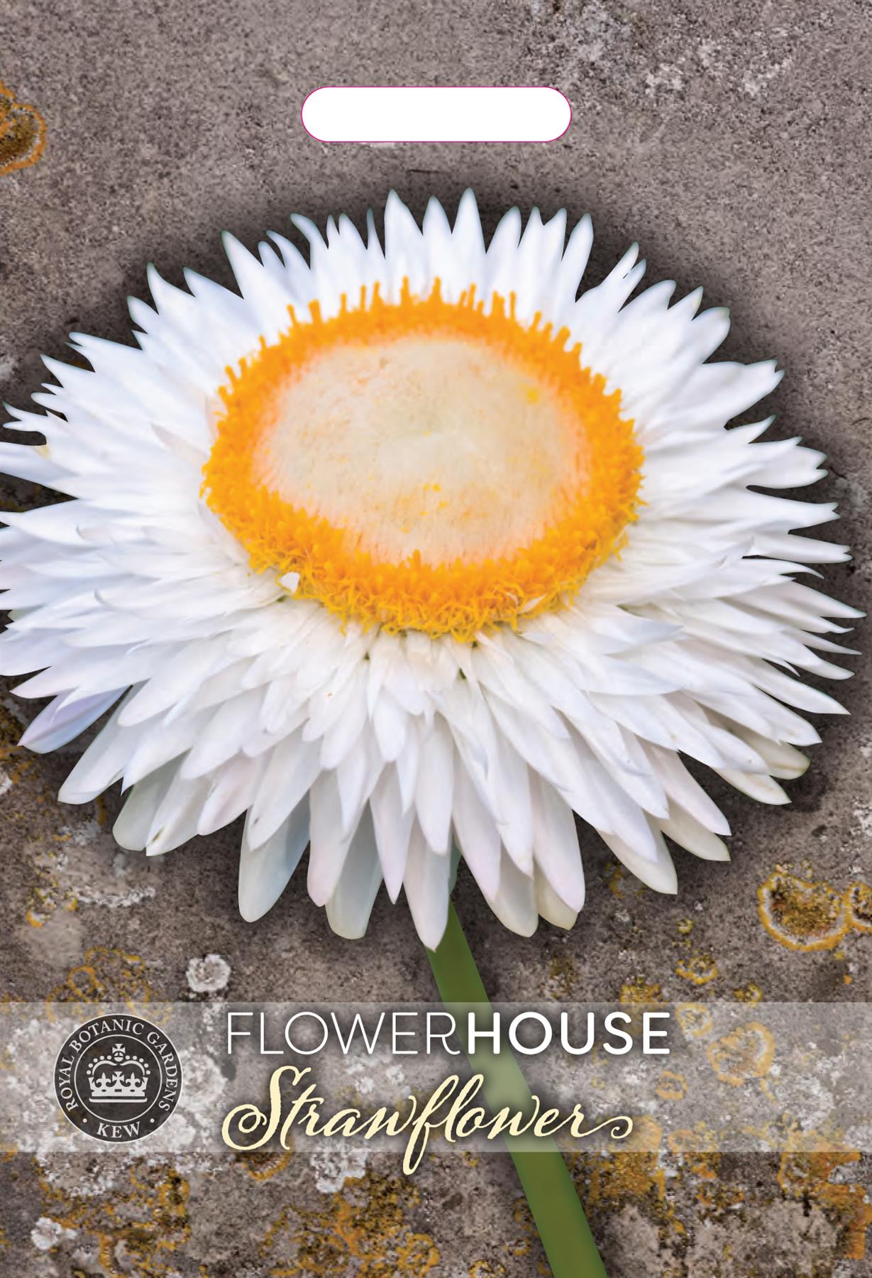 The Helichrysum produces striking, semi-double white blooms that are large and have a unique daisy-like look with a papery texture.