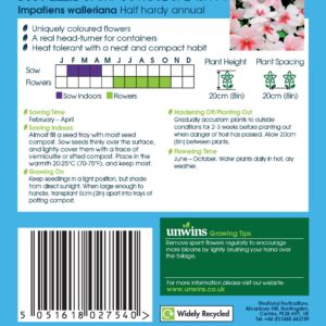 This spectacular Busy Lizzy has uniquely coloured flowers making it a real head-turner for containers and hanging basket as well as in the border. The pretty pink flowers have splashes of deep pink in their centres and plants bear small, deep green leaves. Tolerating higher temperatures these plants retain their neat and compact habit whilst being smothered in delightful blooms for many months.