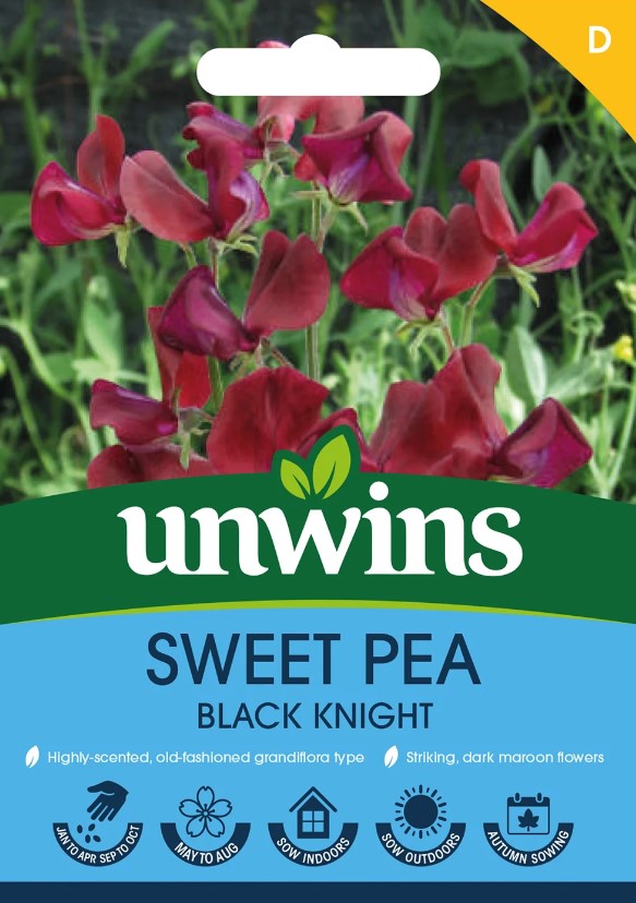 Unwins Sweet Pea Black Knight Seeds boast a rich fragrance and are an old-fashioned grandiflora variety with captivating dark maroon blooms.