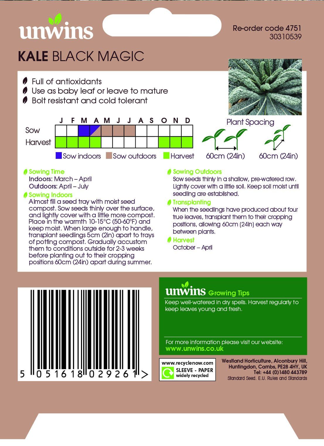 Hailed as a super food Kale is packed full of antioxidants and tastes delicious! This new variety of Tuscan Kale is exceptionally winter hardy and has very dark, crinkled leaves which can be harvested young for baby leaf or left to mature. Bred specifically for the UK climate Black Magic is bolt resistant and cold tolerant